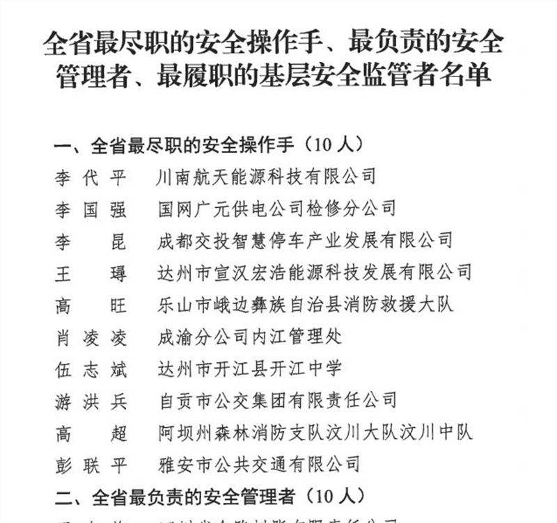 此次评选活动,最终命名“全省最尽职的安全操作手、最负责的安全管理者、最履职的基层安全监管者”各10名。彭联平顺利获得单位自荐、资格审查、初选入围、网络投票、专家评审、综合评审和网上公示层层选拔,最终取得“2021年全省最尽职的安全操作手”称号,是雅安市唯一获此殊荣的个人。