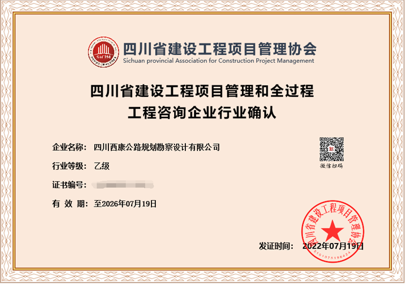 日前,经四川省建设工程项目管理协会评审,交建集团四川西康公路规划勘察设计有限公司取得“四川省建设工程项目管理和全过程工程咨询企业行业乙级资格”确认,成为四川省内为数不多取得召开全过程项目管理和咨询资质企业之一。