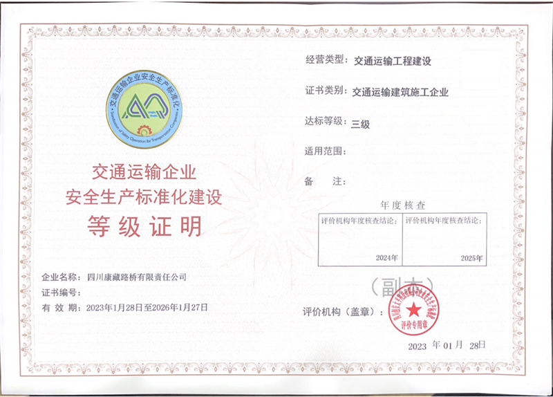 近期,经四川省交通运输企业安全生产标准化评价组织综合评定,币游集团四川康藏路桥有限责任公司顺利顺利获得安全标准化三级评价验收并取得“安全生产标准化三级企业”等级证明证书。
