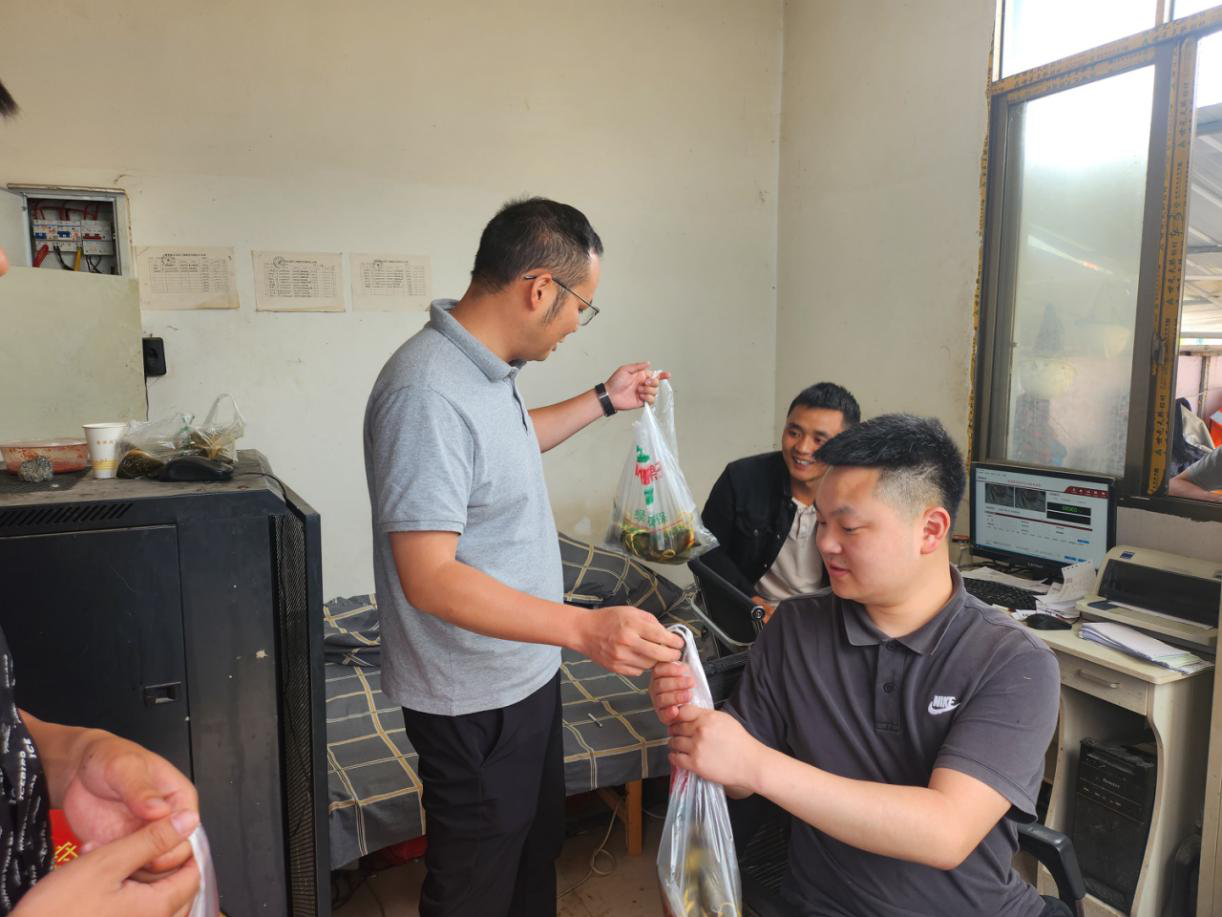 公司食堂内,欢声笑语一片!大家通力合作,在厨房阿姨的教学下包出一个个清香软糯的爱心粽子,一起品尝分享,整个活动过程洋溢着祥和欢快的节日氛围。为让坚守在代碑寺项目一线岗位的员工感受到组织的温暖,随后,公司总经理张忠强带队奔赴代碑寺项目一线岗位,将包好的粽子送到员工手中,并送去节日的祝福。