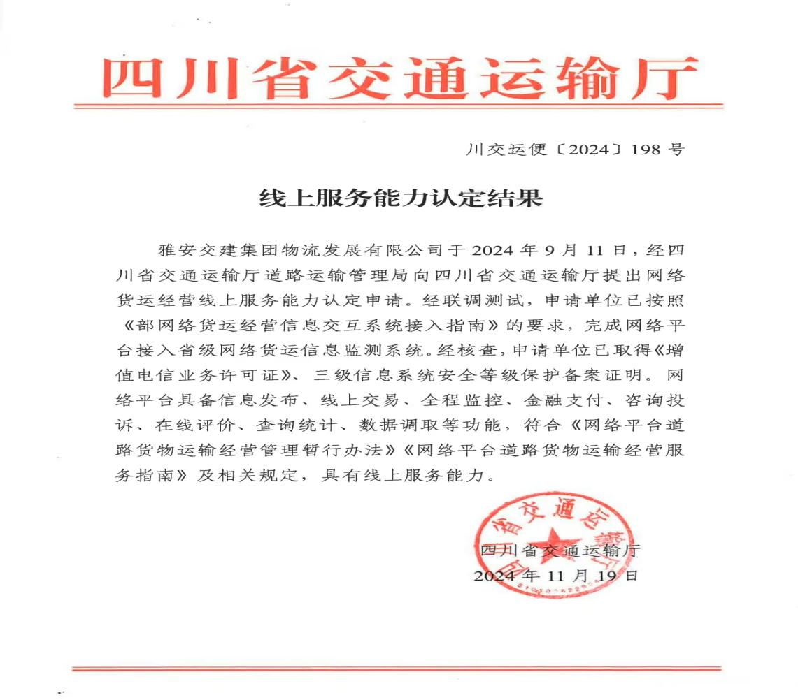 近期,《四川省交通运输厅线上服务能力认定结果》发布,币游集团物流开展有限公司正式取得网络货运经营线上服务能力认定,标志着雅安首家国企网络货运平台即将面向市场运营。
