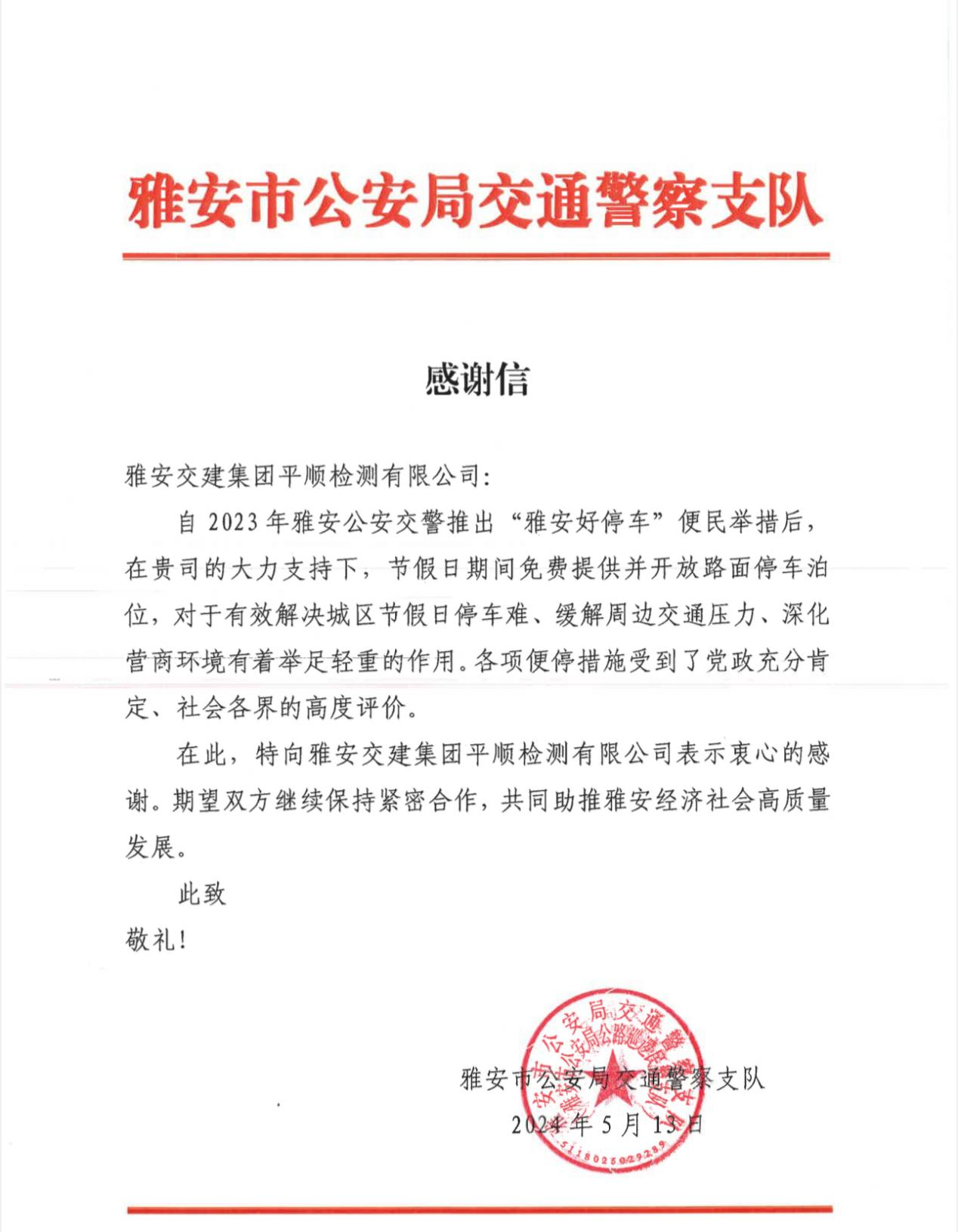 近期,币游集团平顺公司收到一封来自雅安市公安局交通警察支队的感谢信,对平顺公司持续响应雅安公安交警“雅安好停车”便民措施,在节假日期间免费给予并开放路面停车泊位表示感谢。