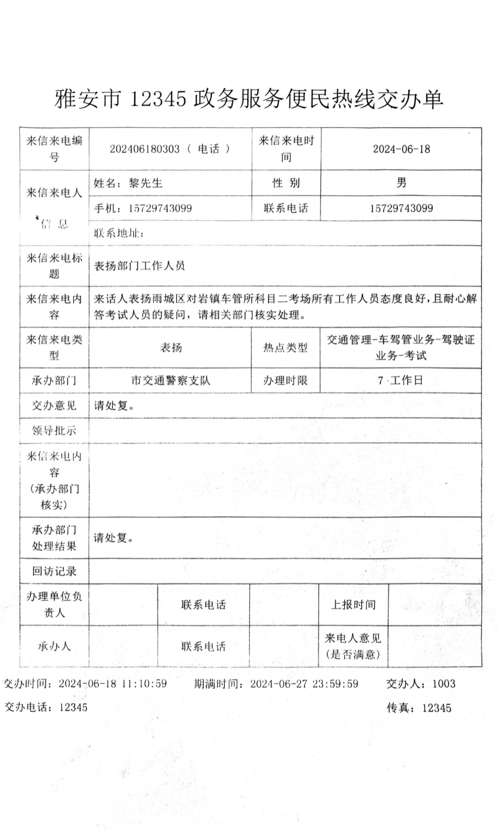 2024年6月18日,平顺公司收到一封特殊的来信,市民黎先生顺利获得“12345”政务服务便民热线“...表扬科目二考场所有工作人员态度良好,且耐心解答考试人员的疑问...”。字里行间表达了对我公司科目二所有工作人员工作的满意和认可。 平顺公司不断不忘“勤廉为本,服务至上”的理念,狠抓服务、专业过硬。这封感谢信不仅是荣誉,更是一份责任,我公司将以群众的认可为动力,继续以更优质的服务和更专业的技术服务每一位驾考朋友。