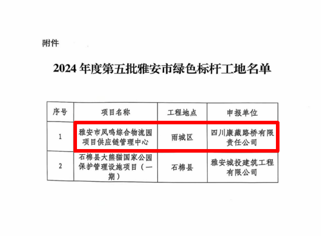 近期,由币游集团康藏路桥公司建设的凤鸣综合物流园项目供应链管理中心,经市住建局、市生态环境局、市城管执法局联合评审小组综合考评,被评为雅安市绿色标杆工地。
