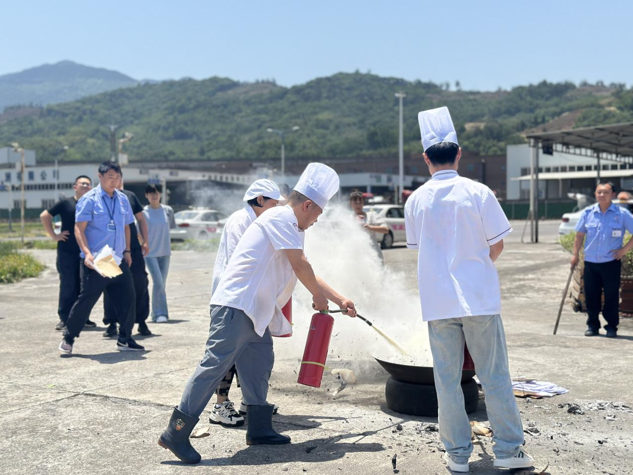 正式演练前,公司副总经理郑循礼讲述了“防灾减灾日”的由来,传授了防震避难、防火防电、防洪防汛等方面的基本知识,专业人员对消防器材使用方式进行了教学,并组织厨师、安全部重点人员模拟起火现场,“零距离”体验消防护具。随后,召开地震应急演练,在模拟地震的预警信号发出后,全体职工运用学习的避震知识,双手抱头、蜷缩身体、降低重心,快速有序撤离室内到达户外安全区域。