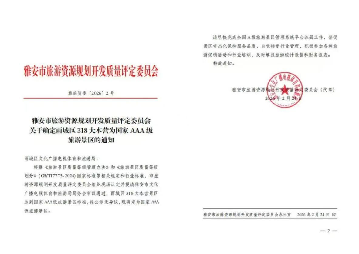 2月24日,经雅安市文化广播电视体育和旅游局局务会审议顺利获得,中国·雅安318自驾大本营正式被确定为国家AAA级旅游景区。