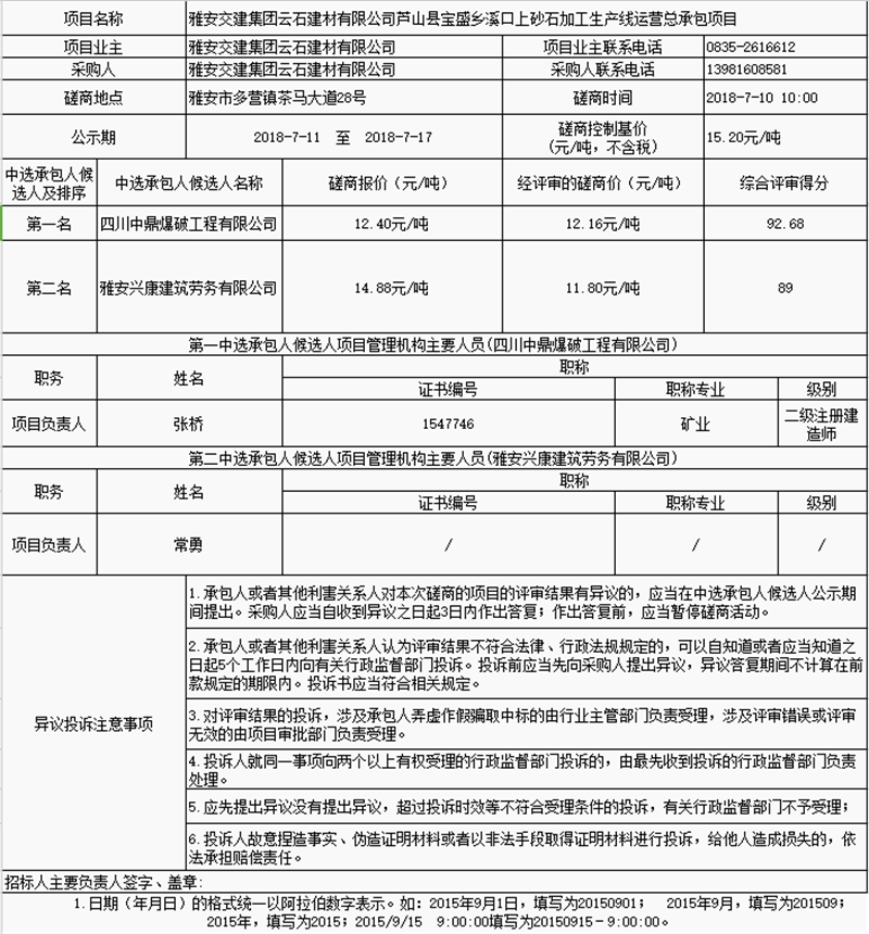 币游集团云石建材有限公司芦山县宝盛乡溪口上砂石加工生产线运营总承包项目中选承包人公示