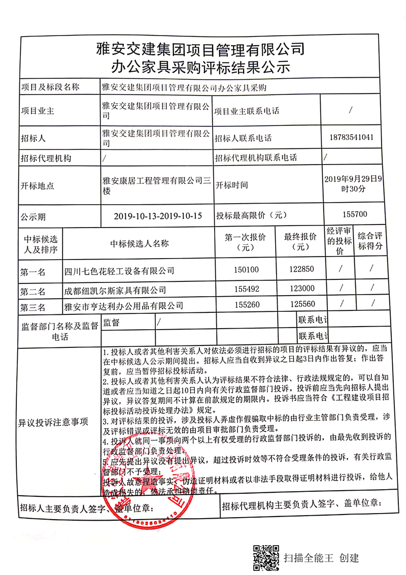币游集团项目管理有限公司办公家具采购评标结果公示