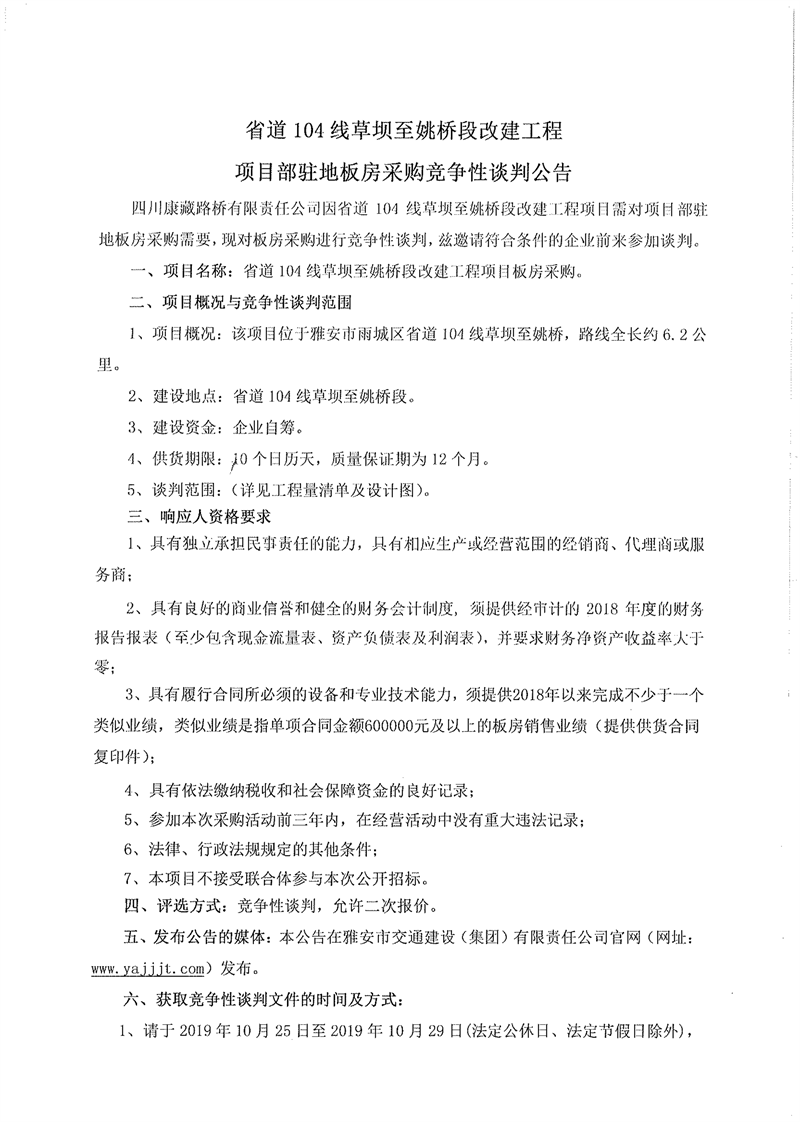 四川康藏路桥有限责任公司省道104线草坝至姚桥段改建工程项目部驻地板房采购竞争性谈判公告