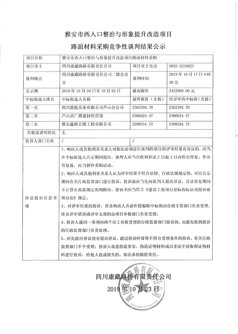 四川康藏路桥有限责任公司雅安市西入口整治与形象提升改造项目路面材料采购竞争性谈判结果公示
