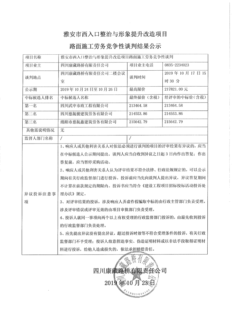 四川康藏路桥有限责任公司雅安市西入口整治与形象提升改造项目路面施工劳务竞争性谈判结果公示