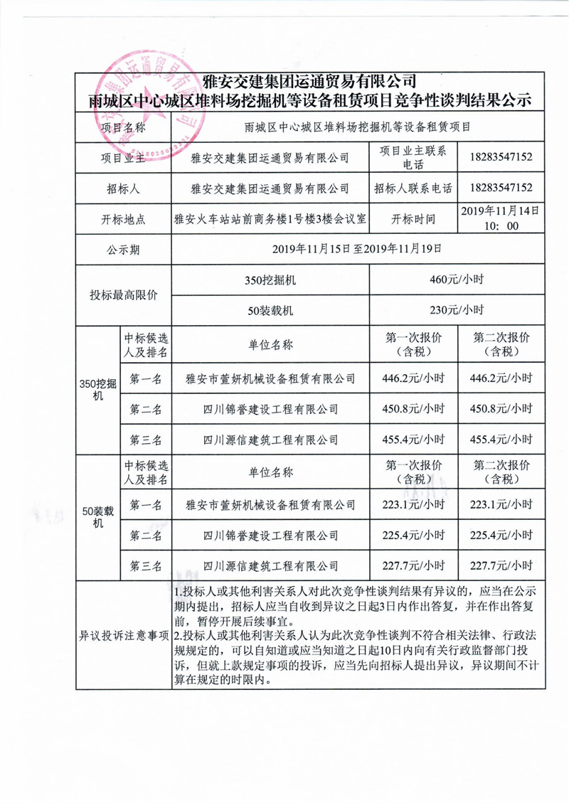 币游集团运通贸易有限公司雨城区中心城区堆料场挖掘机等设备租赁项目竞争性谈判结果公示