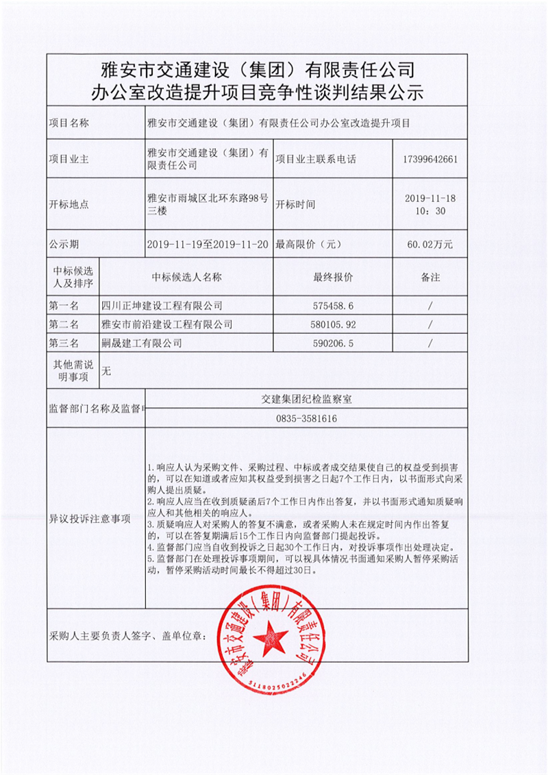 雅安市交通建设(集团)有限责任公司办公室改造提升项目竞争性谈判结果公示