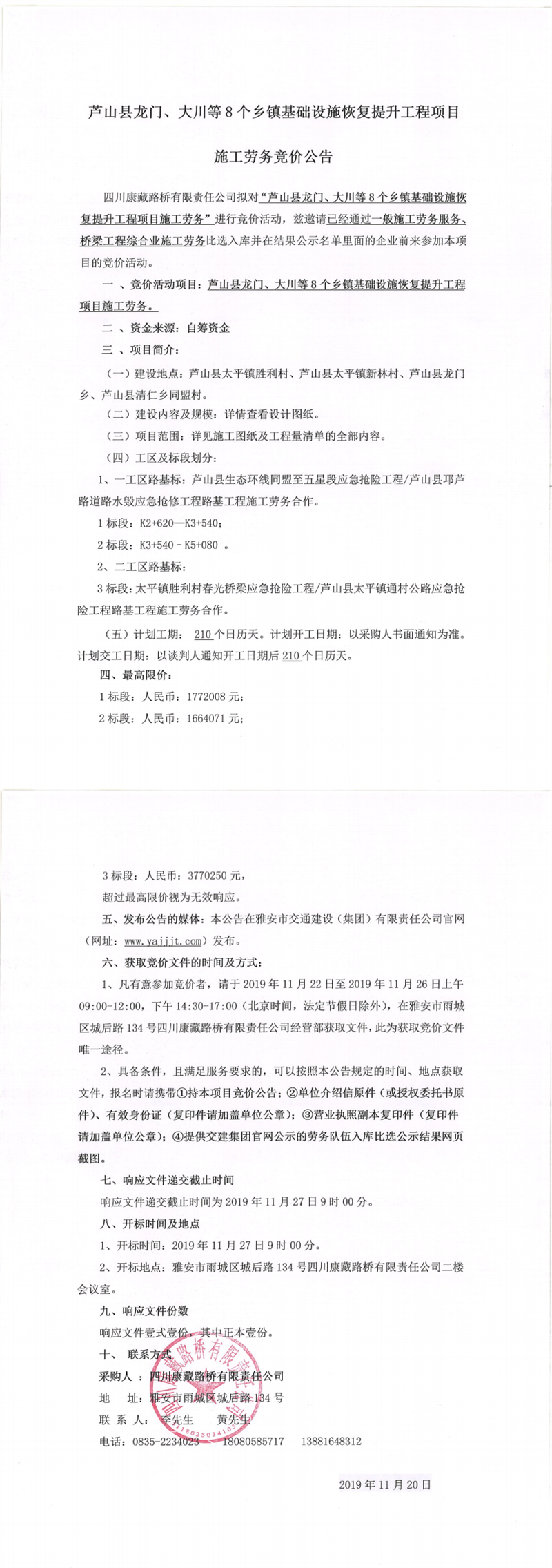 四川康藏路桥有限责任公司芦山县龙门、大川等8个乡镇基础设施恢复提升工程项目施工劳务竞价公告
