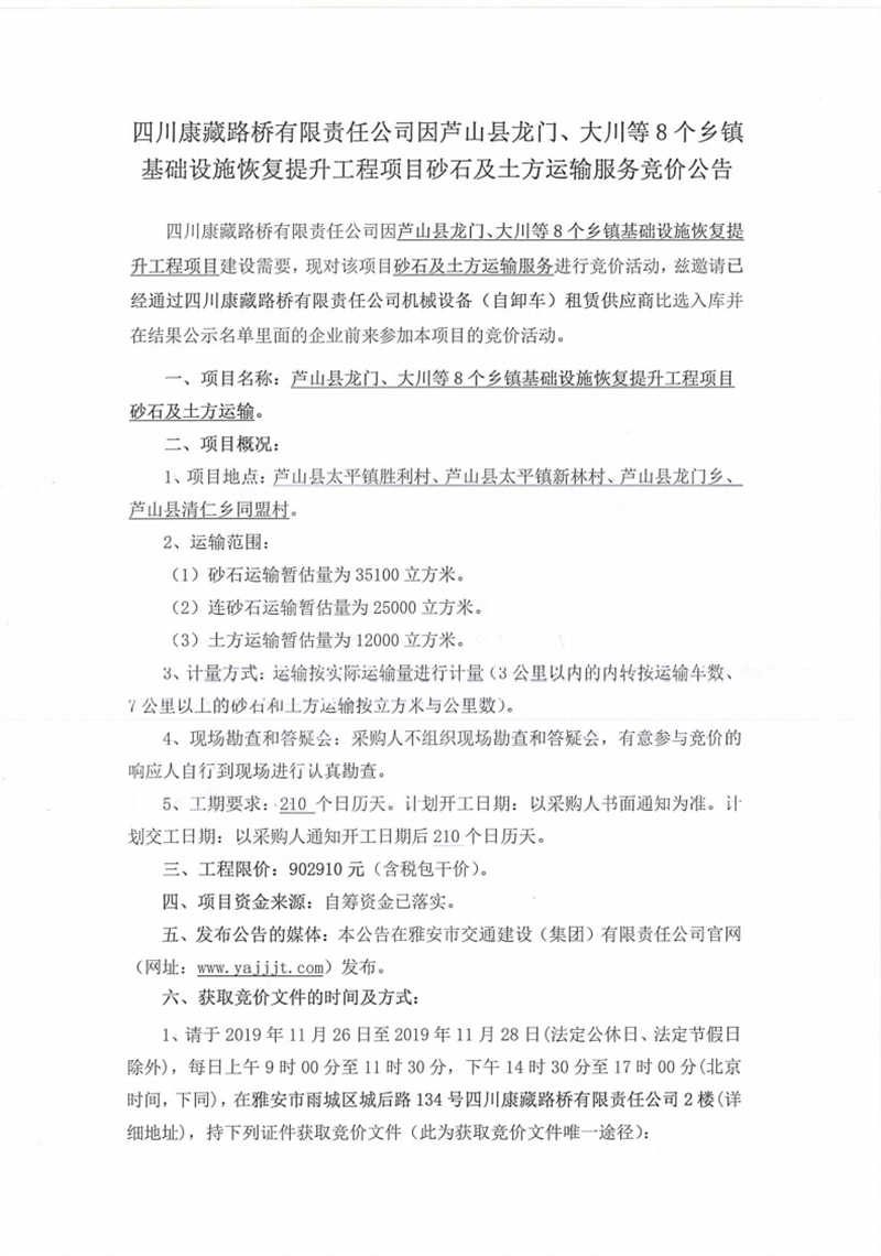 四川康藏路桥有限责任公司芦山县龙门、大川等8个乡镇基础设施恢复提升工程项目砂石及土方运输服务竞价公告