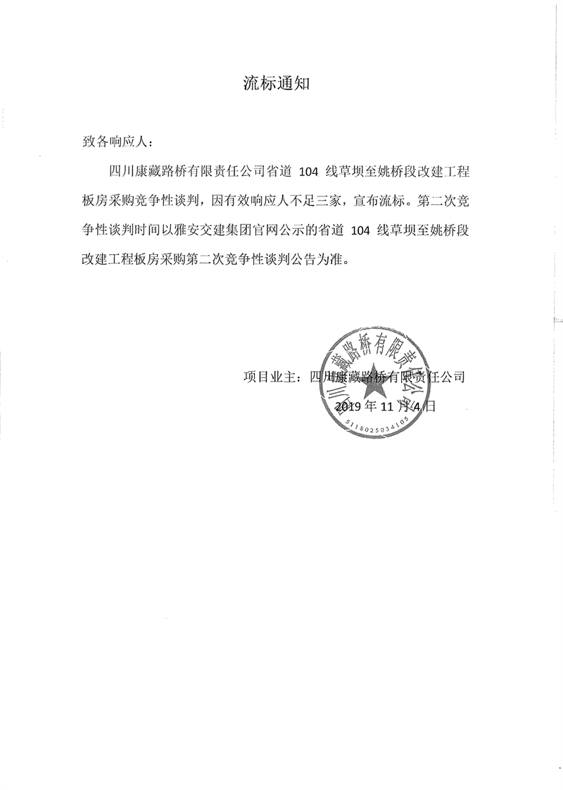 四川康藏路桥有限责任公司省道104线草坝至姚桥段改建工程板房采购项目流标通知