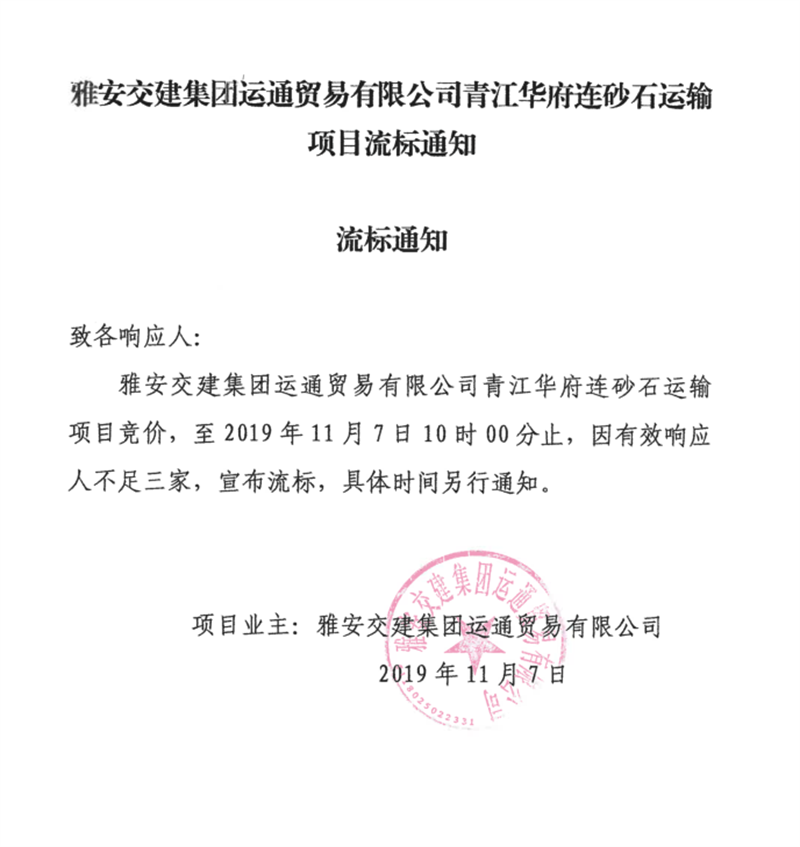 币游集团运通贸易有限公司青江华府砂石运输项目流标通知