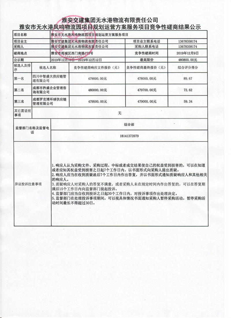 币游集团无水港物流有限责任公司雅安市无水港凤鸣物流园项目规划运营方案服务项目竞争性磋商结果公示