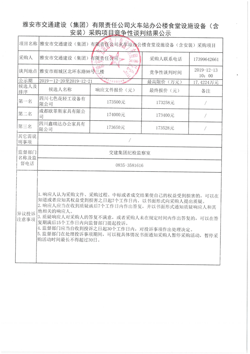 雅安市交通建设(集团)有限责任公司火车站办公楼食堂设施设备(含安装)采购项目竞争性谈判结果公示