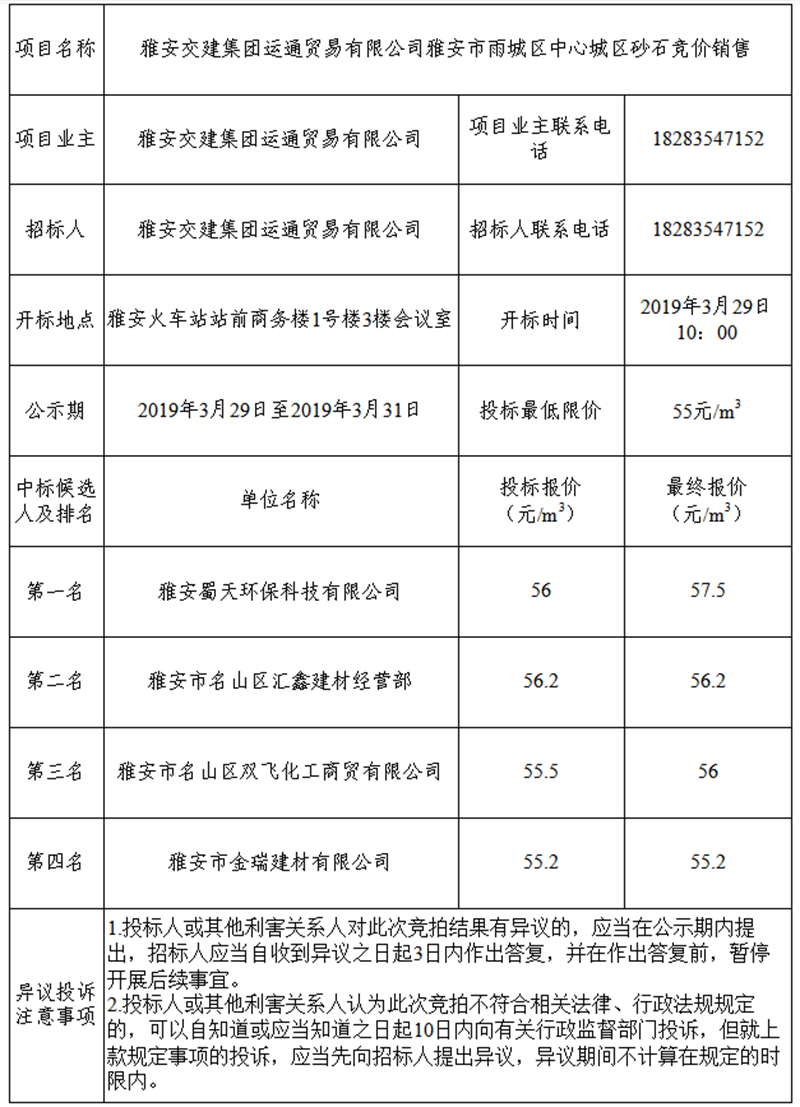 币游集团运通贸易有限公司关于雅安市雨城区中心城区砂石竞拍结果公示