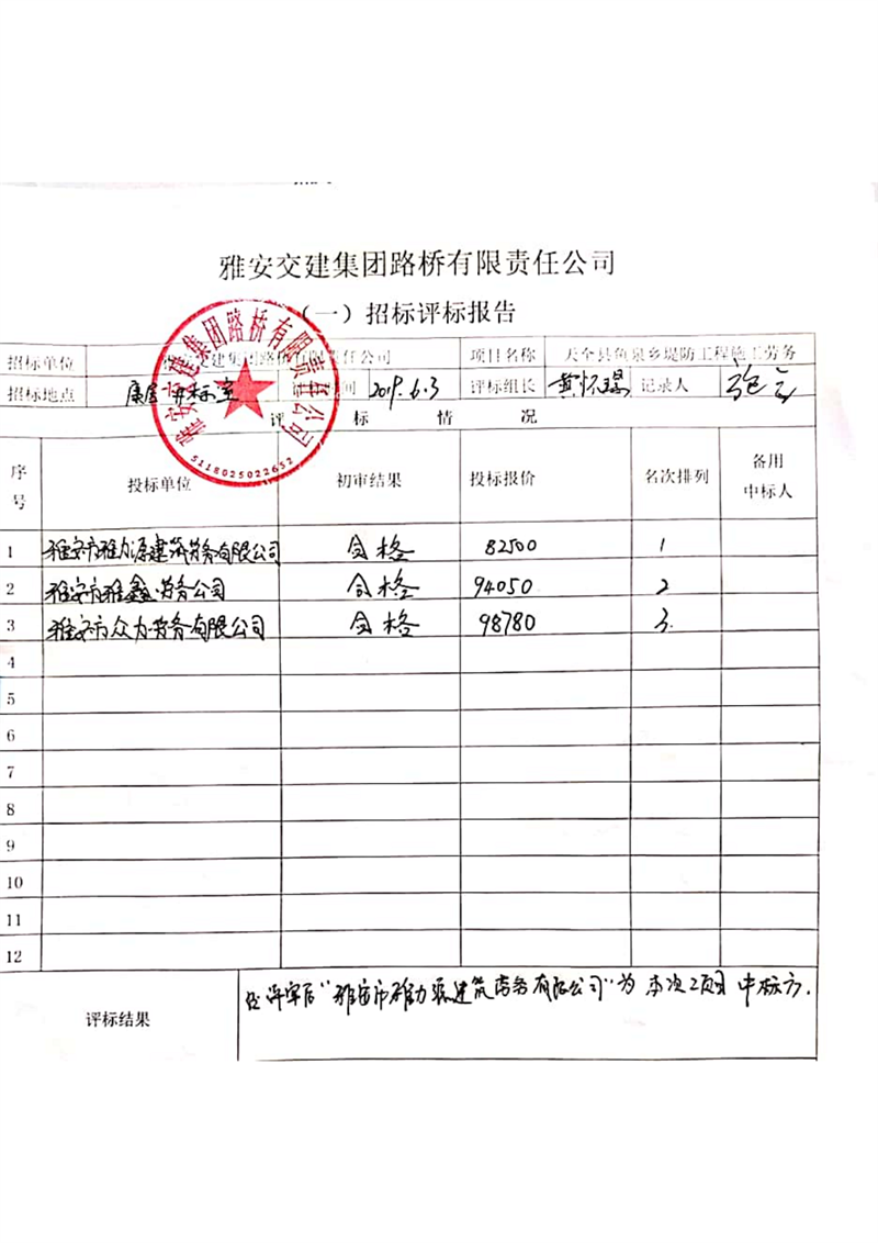 雅安交通建设(集团)有限责任公司桥梁工程劳务队伍入库比选结果