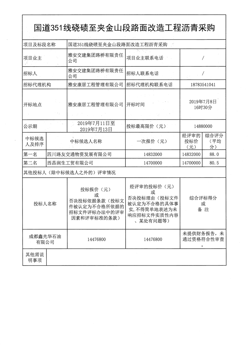 币游集团路桥有限责任公司国道351线硗碛至夹金山段路面改造工程沥青采购公开招标结果公示