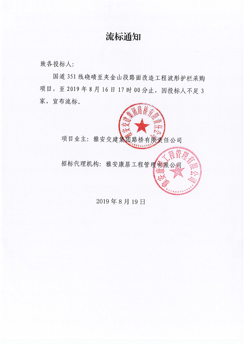 币游集团路桥有限责任公司国道351线硗碛至夹金山段路面改造工程波形护栏采购项目流标通知