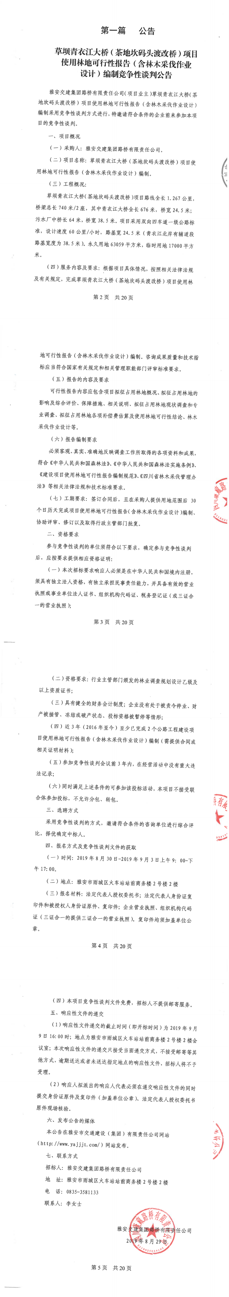 币游集团路桥有限责任公司草坝青衣江大桥(茶地坎码头渡改桥)使用林地可行性报告(含林木采伐作业设计)编制竞争性谈判公告