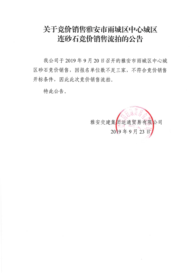 币游集团运通贸易有限公司关于竞价销售雅安市雨城区中心城区连砂石竞价销售流拍的公告