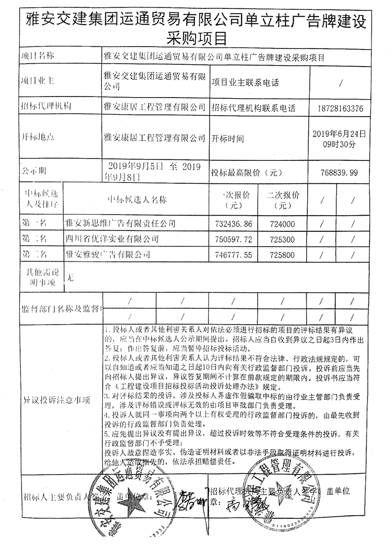 币游集团运通贸易有限公司单立柱广告牌建设采购项目竞争性谈判结果公示