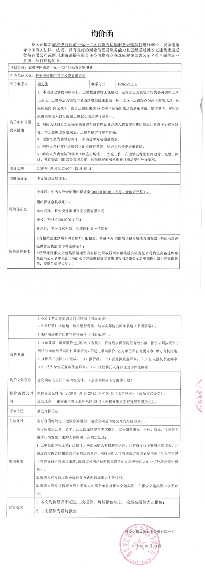 币游集团兴宝投资有限公司成雅快速通道一标一工区砂砾石运输服务采购项目询价函