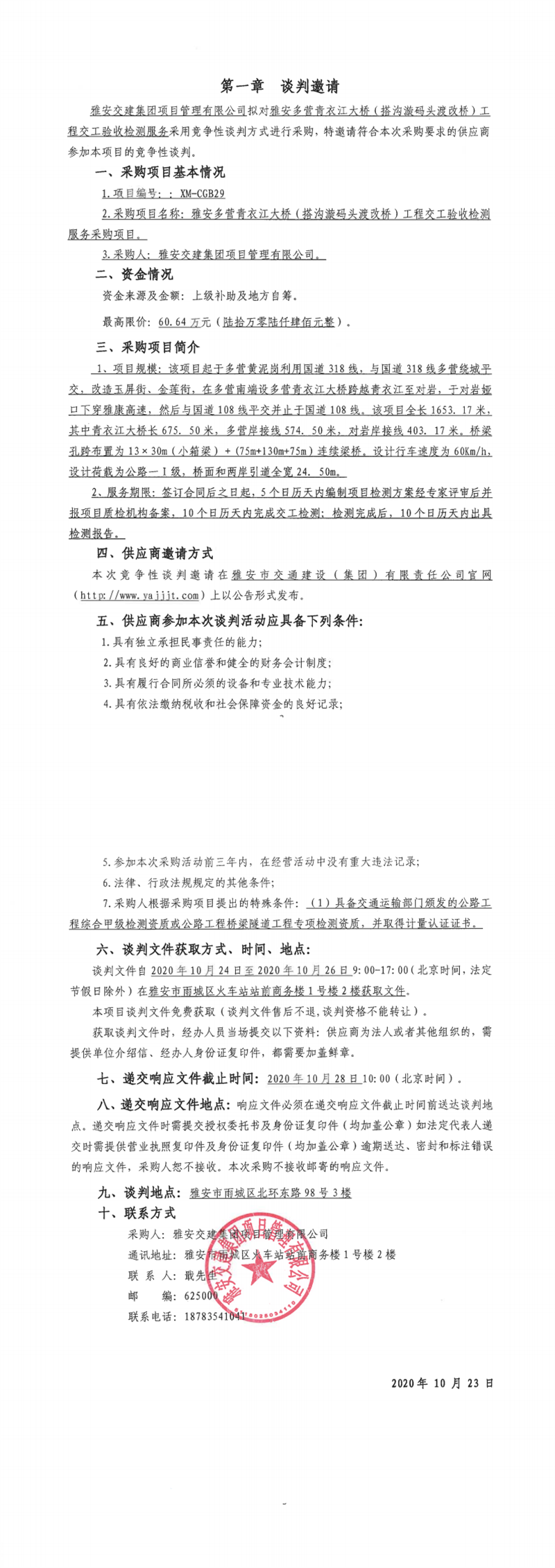 币游集团项目管理有限公司雅安多营青衣江大桥(搭沟漩码头渡改桥)工程交工验收检测服务采购项目竞争性谈判公告