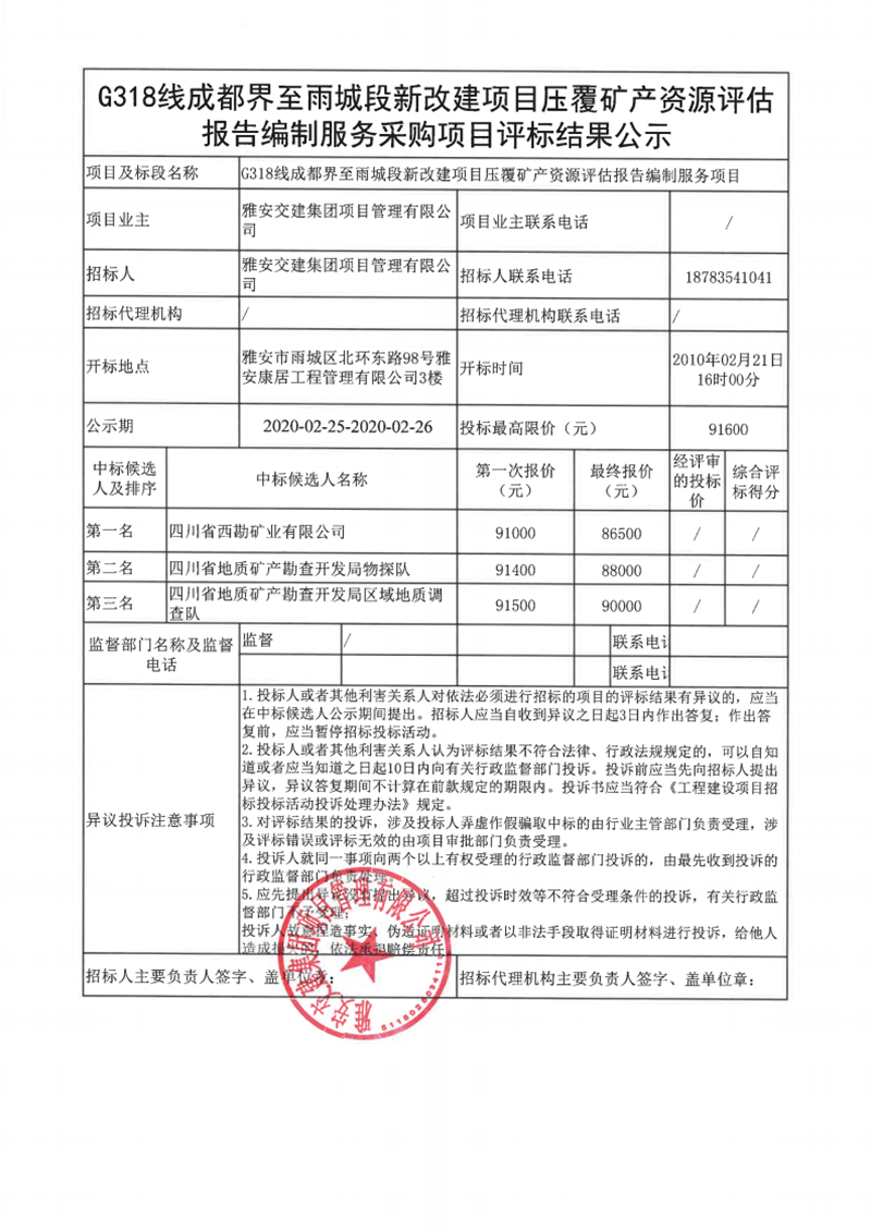 币游集团项目管理有限公司G318线成都界至雨城段新改建项目压覆矿产资源评估报告编制服务采购项目评标结果公示