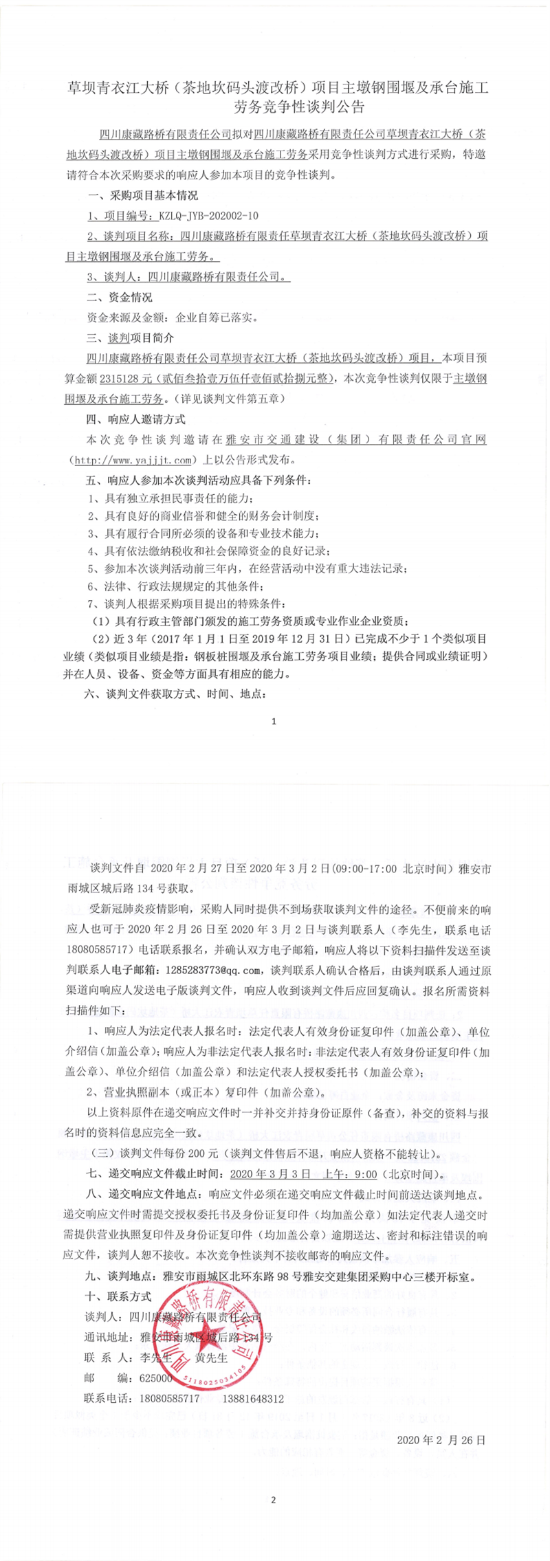四川康藏路桥有限责任公司草坝青衣江大桥(茶地坎码头渡改桥)项目主墩钢围堰及承台施工劳务竞争性谈判公告