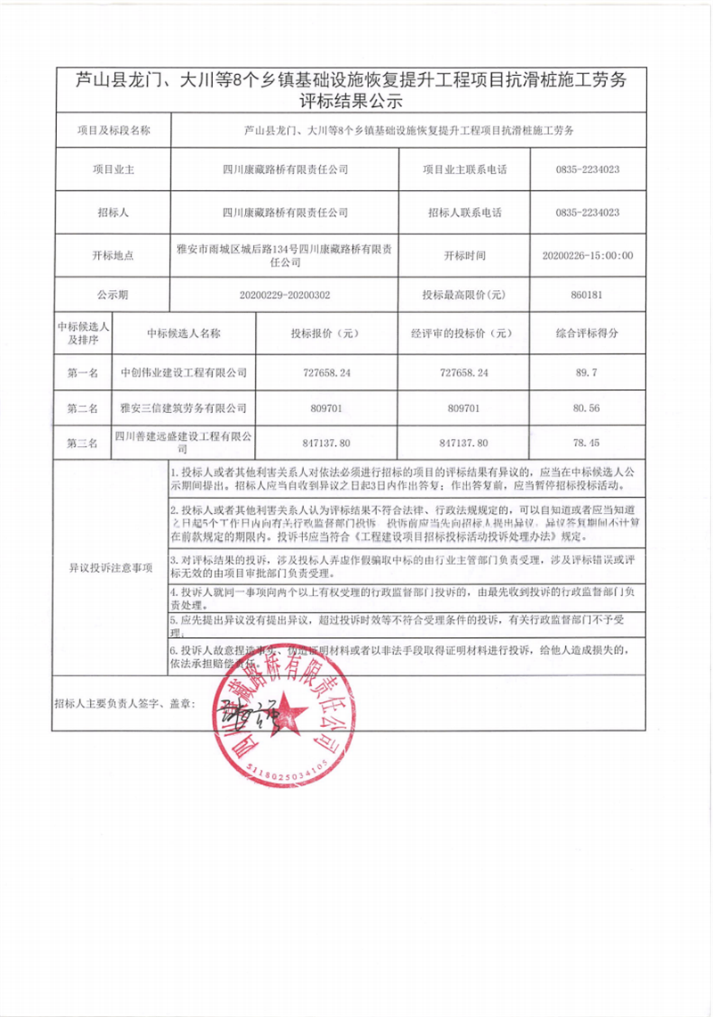 四川康藏路桥有限责任公司芦山县龙门、大川等8个乡镇基础设施恢复提升工程项目抗滑桩施工劳务评标结果公示