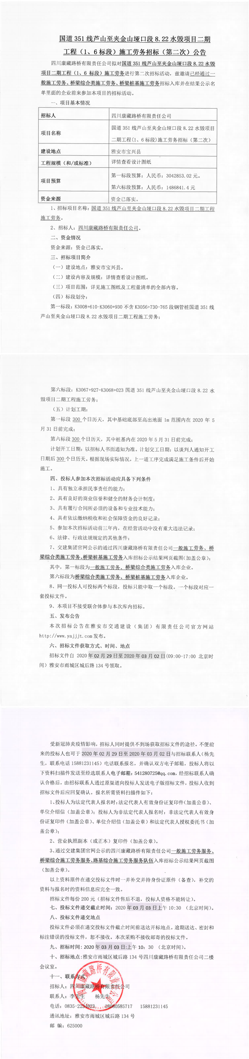四川康藏路桥有限责任公司国道351线芦山至夹金山垭口8.22水毁项目二期工程(1、6标段)施工劳务招标(第二次)公告