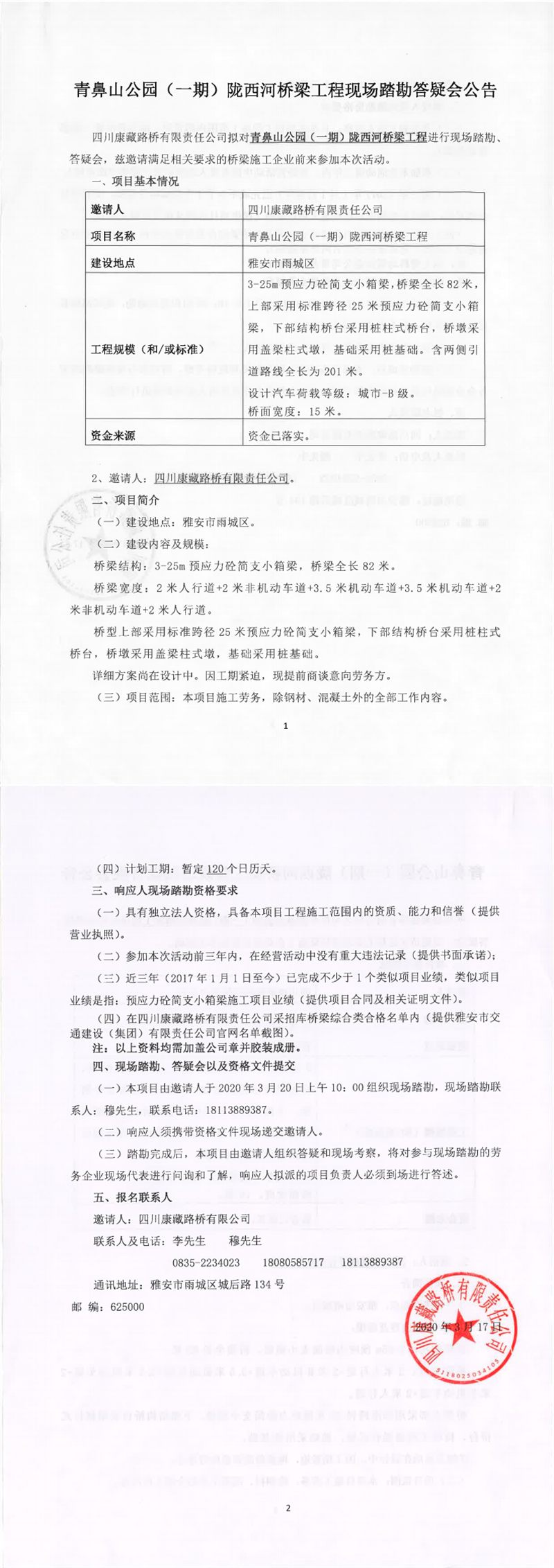 四川康藏路桥有限责任公司青鼻山公园(一期)陇西河桥梁工程现场踏勘答疑会公告