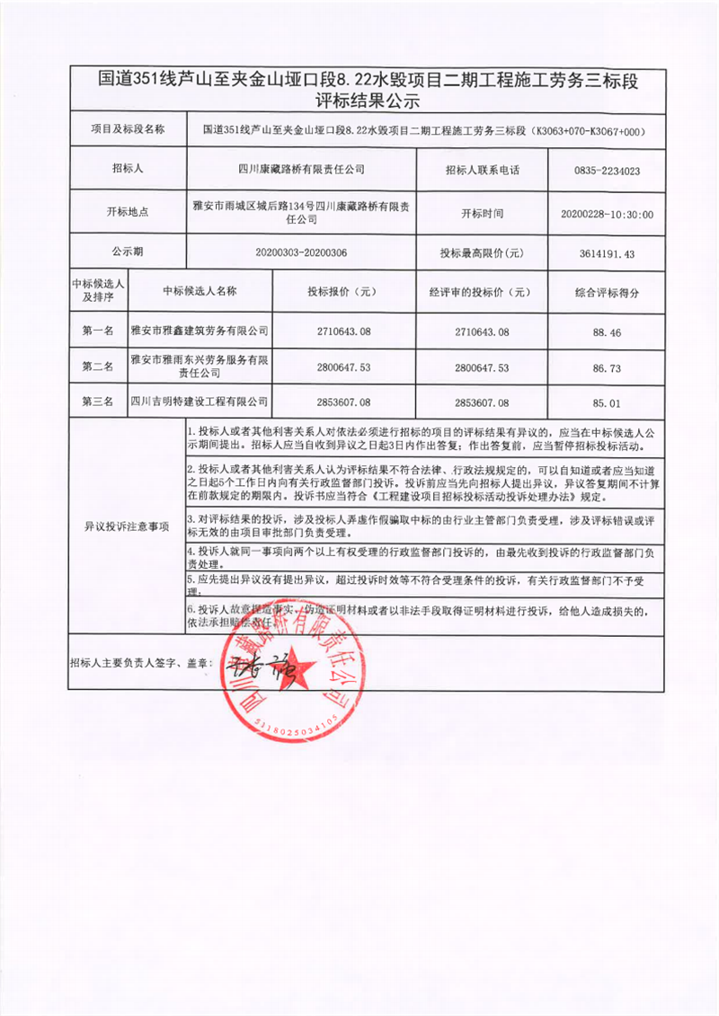 四川康藏路桥有限责任公司国道351线芦山至夹金山垭口段8.22水毁项目二期工程施工劳务三标段评标结果公示