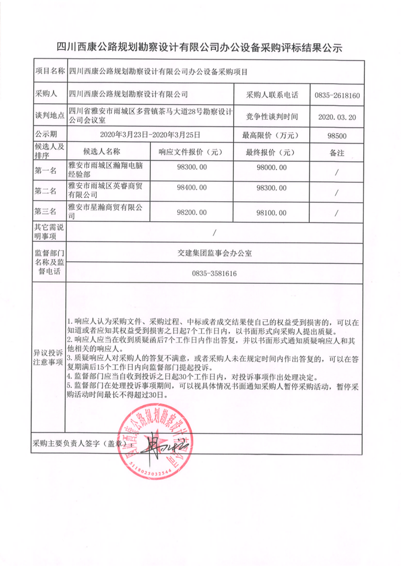 四川西康公路规划勘察设计有限公司办公设备采购评标结果公示