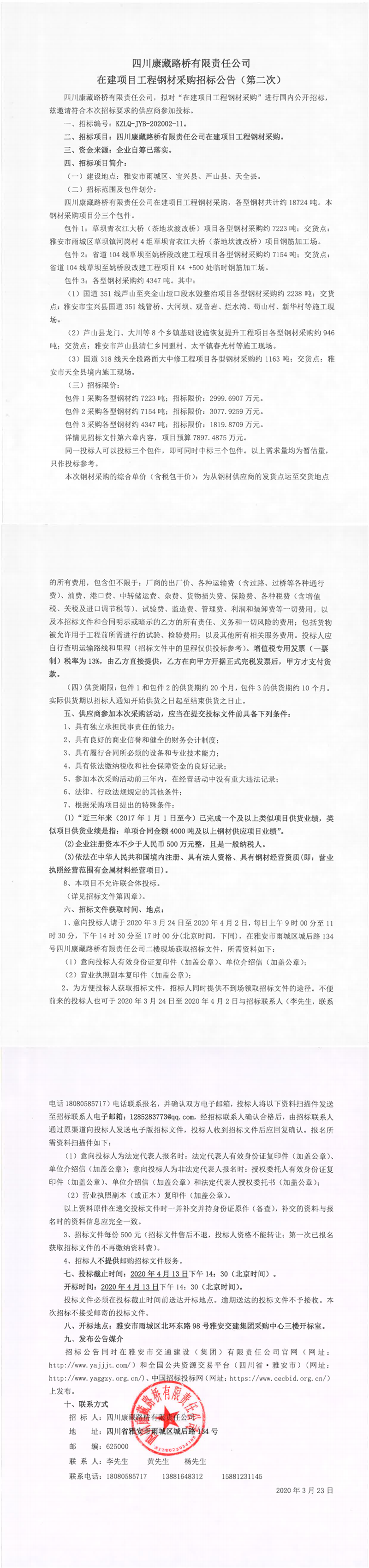 四川康藏路桥有限责任公司在建项目工程钢材采购招标公告(第二次)