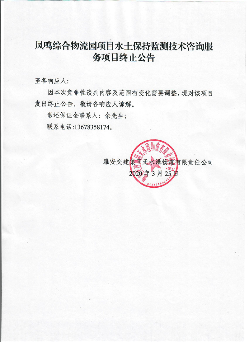 币游集团无水港物流有限责任公司凤鸣综合物流园项目水土保持监测技术咨询服务项目终止公告