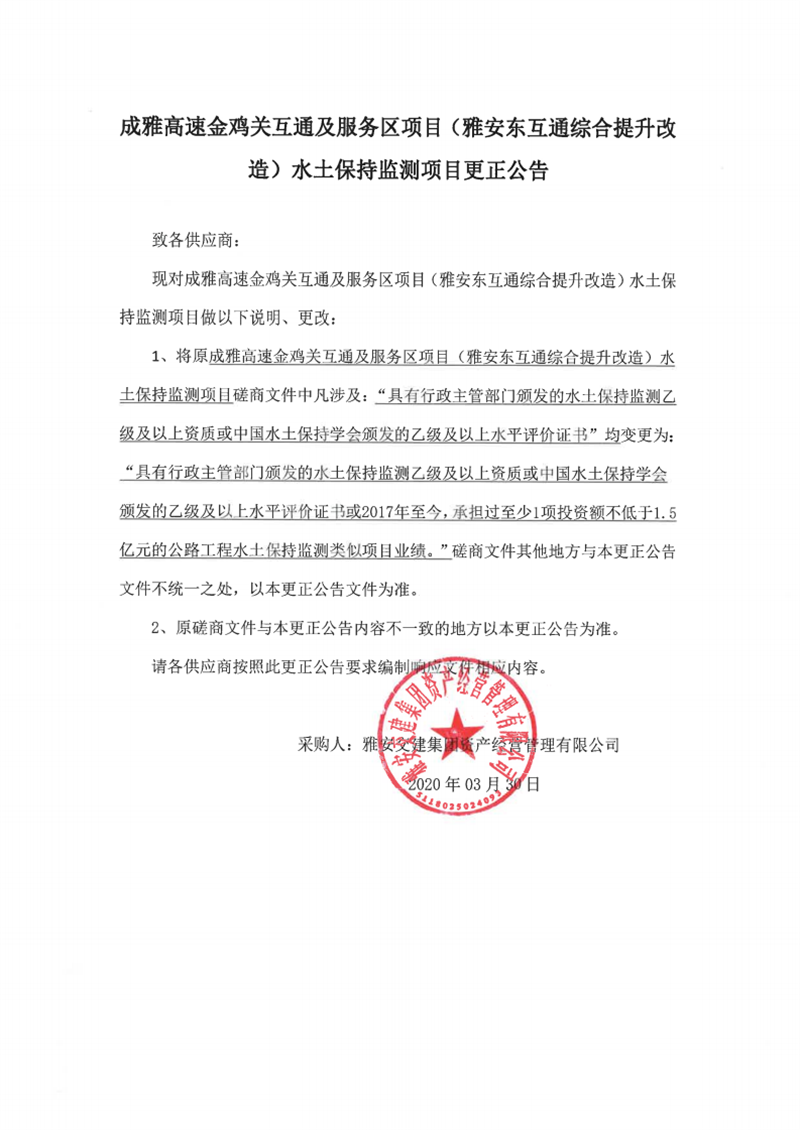 币游集团资产经营管理有限公司成雅高速金鸡关互通及服务区项目(雅安东互通综合提升改造)水土保持监测项目更正公告
