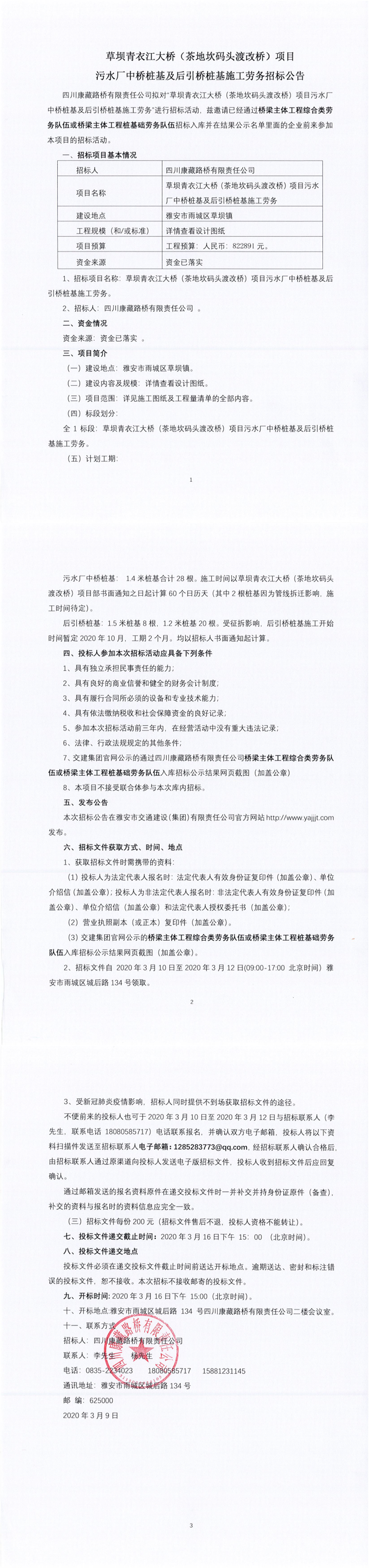 四川康藏路桥有限责任公司草坝青衣江大桥(茶地坎码头渡改桥)项目污水厂中桥桩基及后引桥桩基施工劳务招标公告