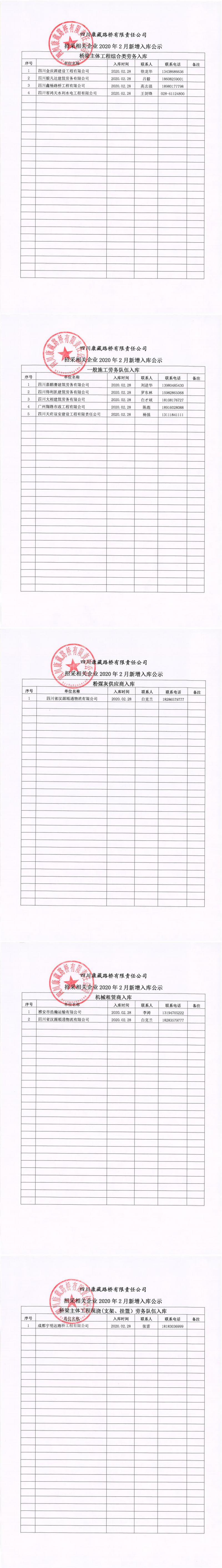 四川康藏路桥有限责任公司招采相关企业2020年2月新增入库公示