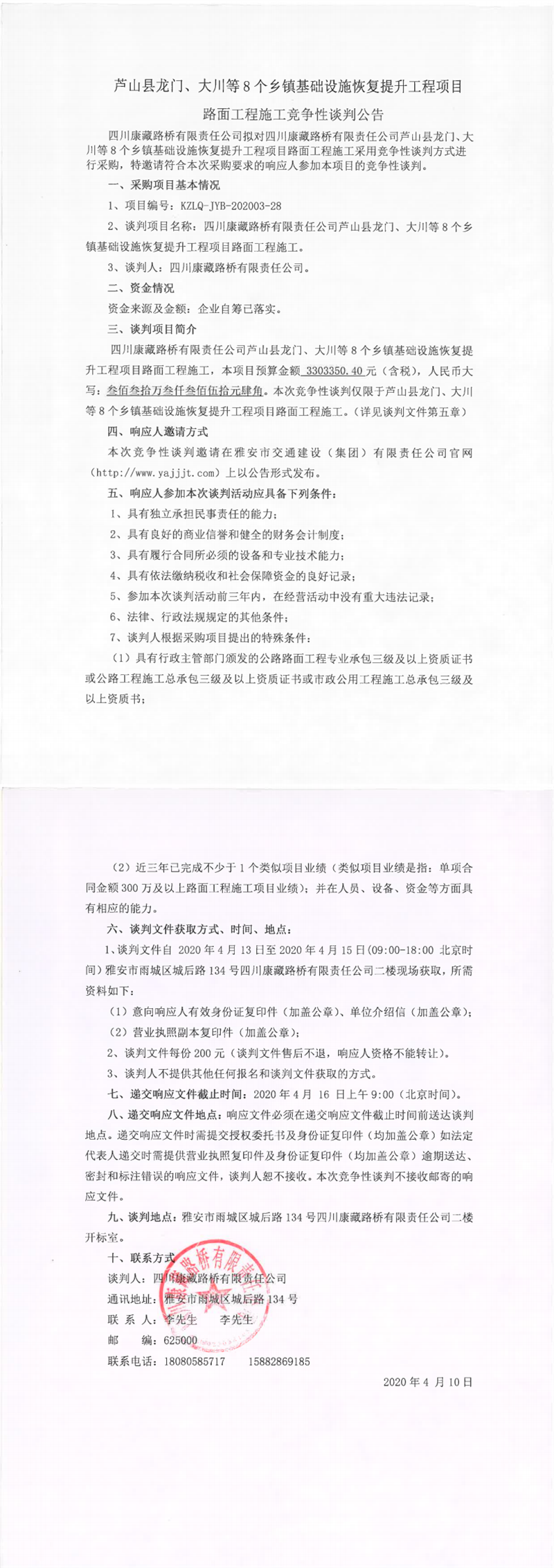 四川康藏路桥有限责任公司芦山县龙门、大川等8个乡镇基础设施恢复提升工程项目路面工程施工竞争性谈判公告