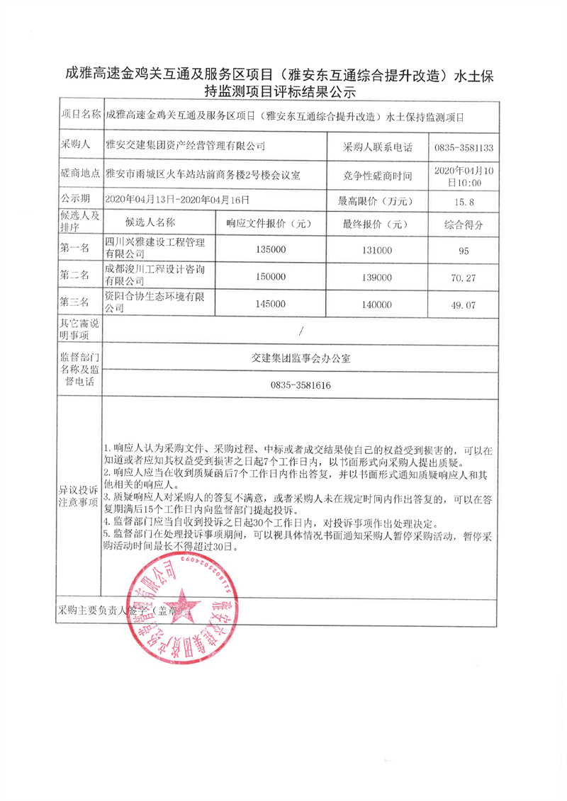 币游集团资产经营管理有限公司成雅高速金鸡关互通及服务区项目(雅安东互通综合提升改造)水土保持监测项目评标结果公示