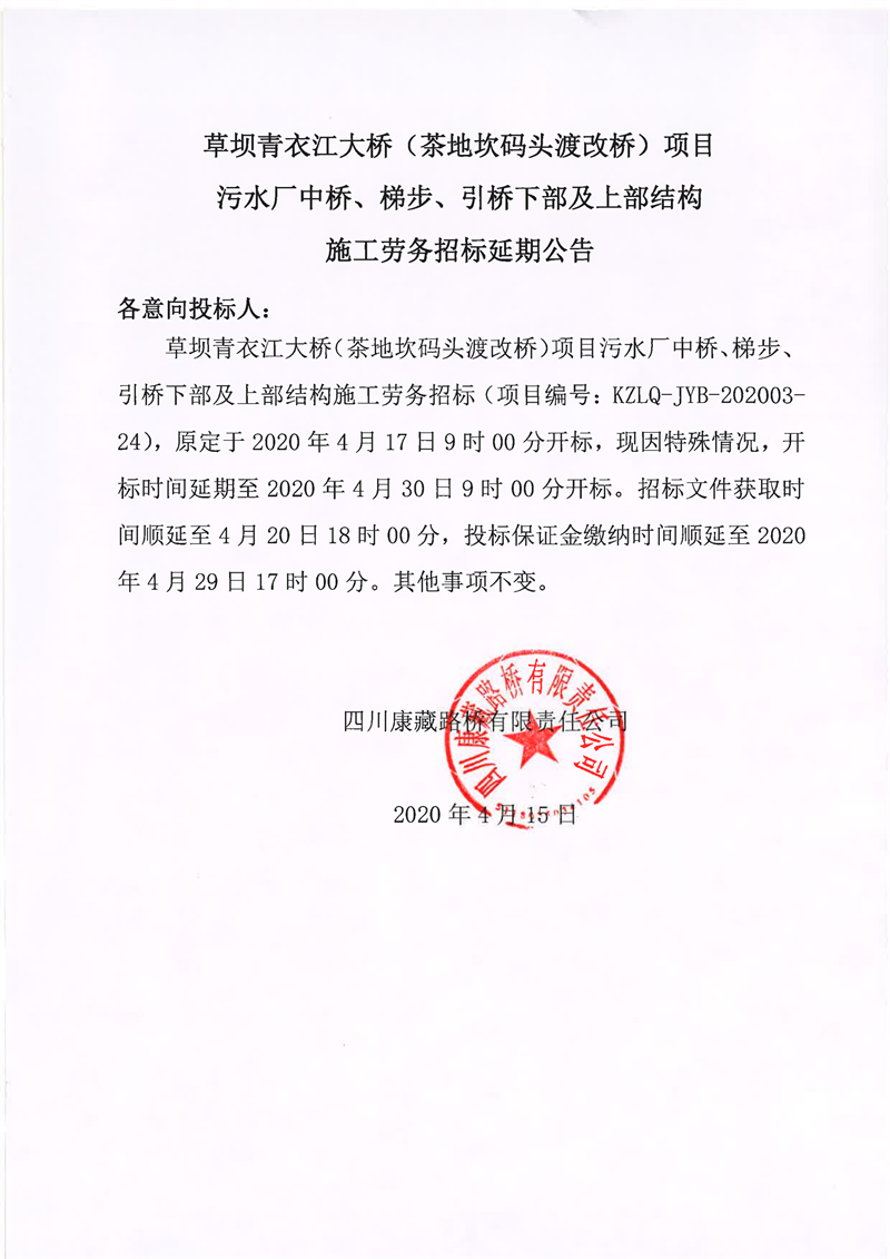 四川康藏路桥有限责任公司草坝青衣江大桥(茶地坎码头渡改桥)项目污水厂中桥、梯步、引桥下部及上部结构施工劳务招标延期公告