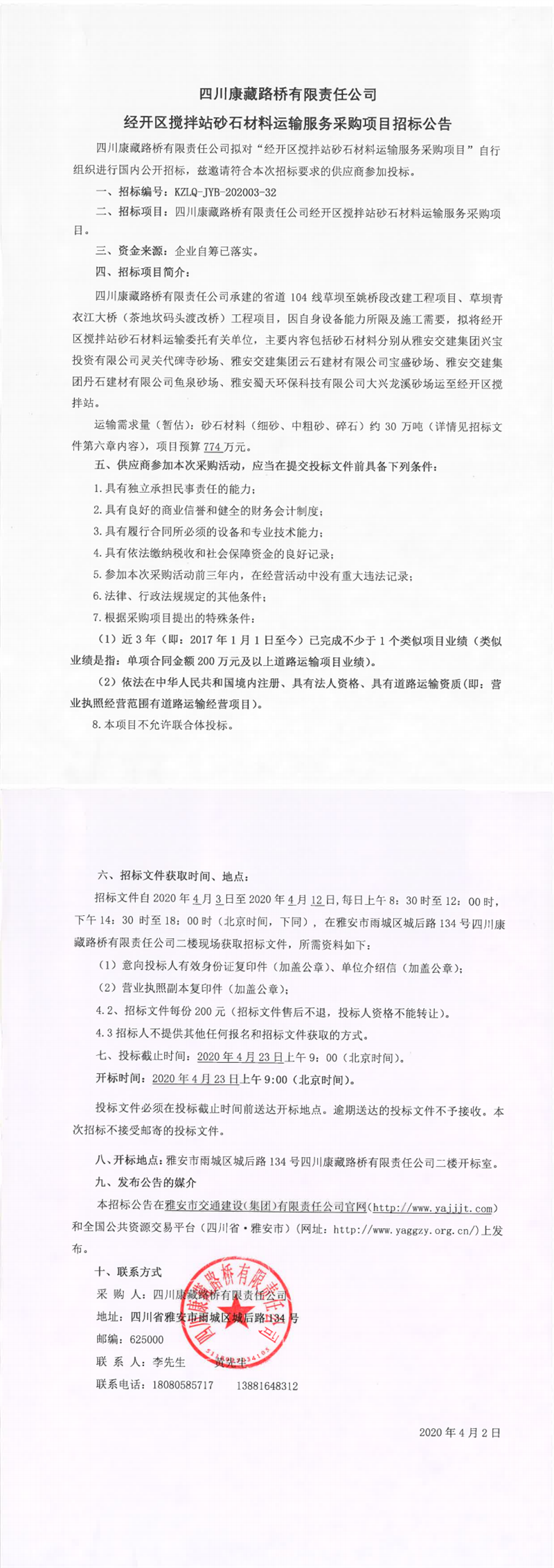 四川康藏路桥有限责任公司经开区搅拌站砂石材料运输服务采购项目招标公告