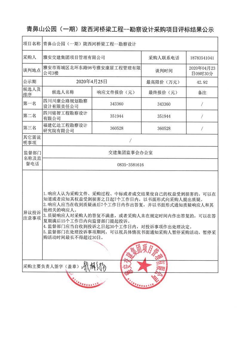 币游集团项目管理有限公司青鼻山公园(一期)陇西河桥梁工程项目勘察设计采购项目评标结果公示
