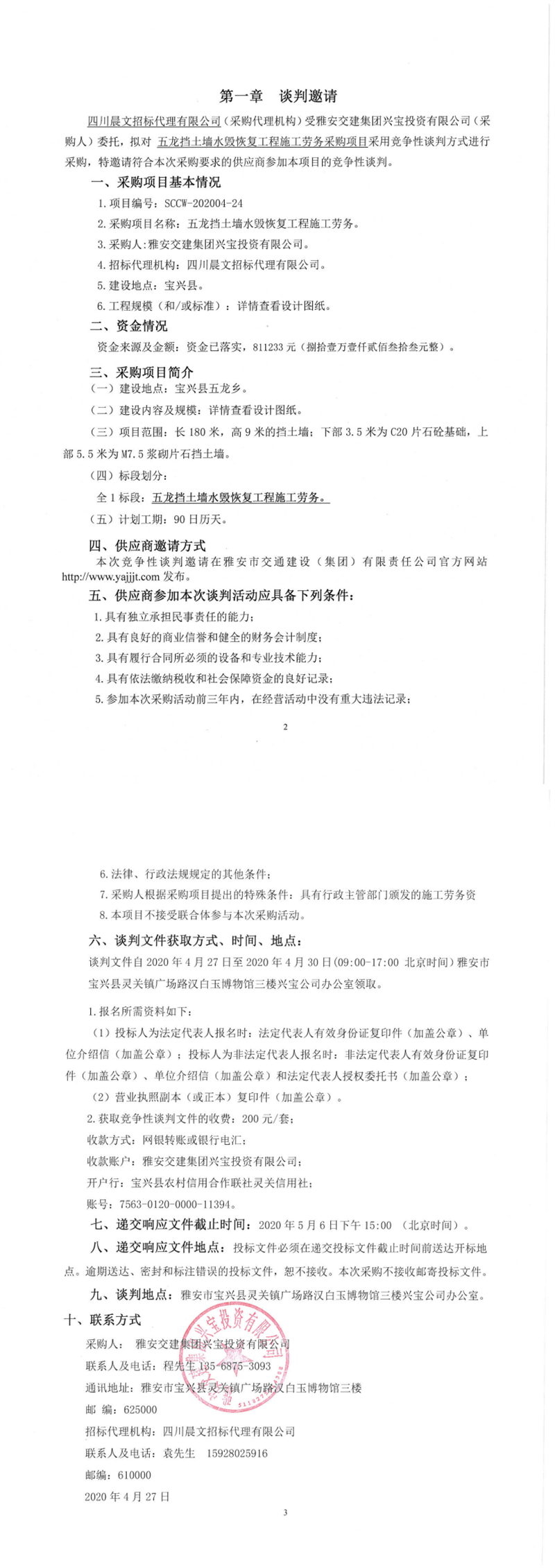 币游集团兴宝投资有限公司五龙挡土墙水毁恢复工程施工劳务采购项目竞争性谈判公告